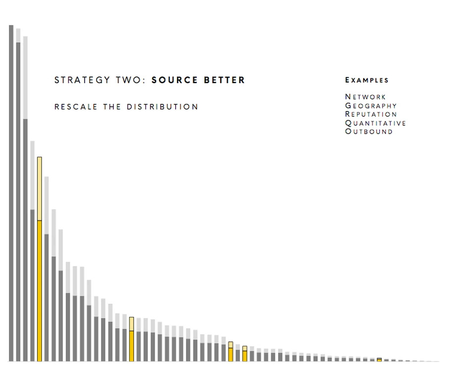 Sourcing better is a real strategy because it rescales the distribution. Even a random selection of investments from a better-sourced distribution of companies will have a higher expected return than an average venture fund. Fishing in a better pond can make as much (or more) difference as being a better fisherman.